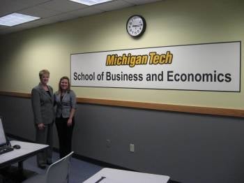 The School of Business and Economics got a visit from Anne Herron this week, who came to campus to speak with Associate Professor Mari Buche’s Business Intelligence class. Having graduated from Michigan State with a B.S. in Chemistry, Anne started her professional career working for DOW Chemical as an analytical chemist in polymer sciences. After leaving DOW, Anne has remained at Allis Information Management, Inc. (AIM) for fifteen years and has climbed the ladder to the role of Vice President and co-owner of the company. Her responsibilities include work in client/project development, and managing a team of information researchers and analysts.