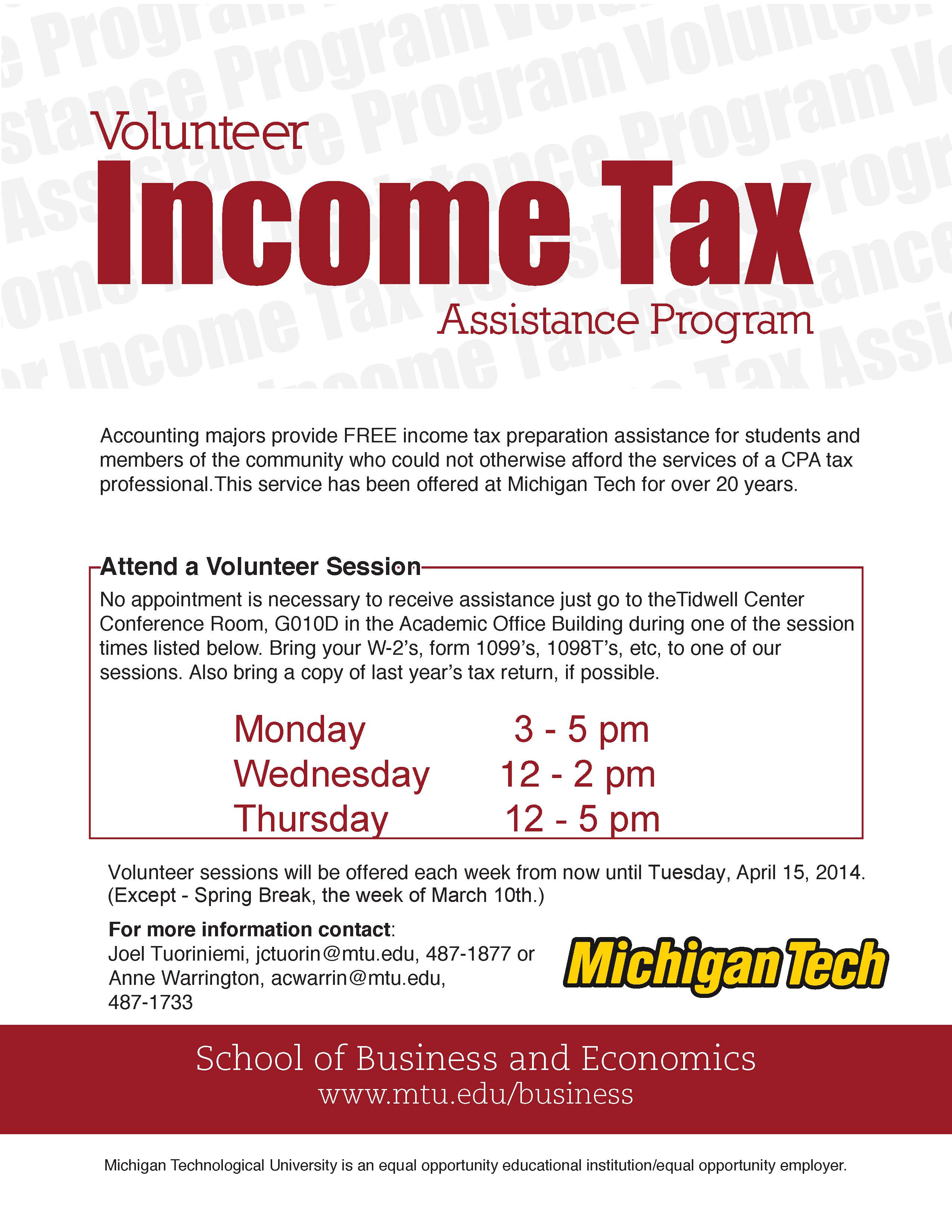 Accounting majors provide FREE income tax preparation assistance for students and members of the community who could not otherwise afford the services of a CPA tax professional. This service has been offered at Michigan Tech for over 20 years.