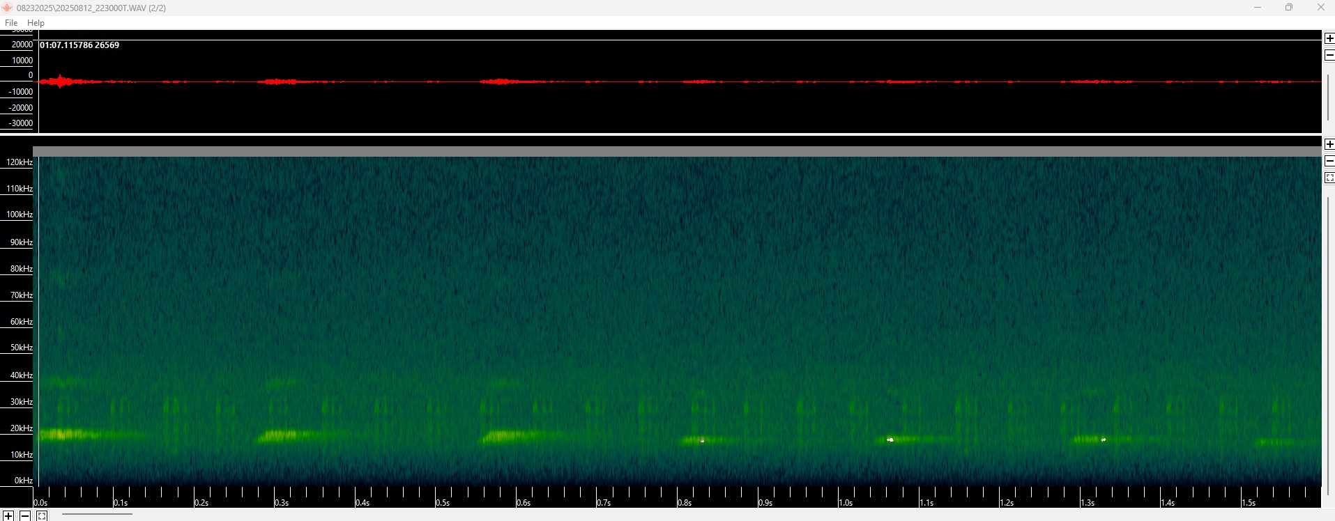 Using a program called Kaleidoscope, the sound clips were turned into visual spectrograms, which students manually compared to waveforms of bat echolocation calls to identify which species were recorded, along with the time and number of calls.
