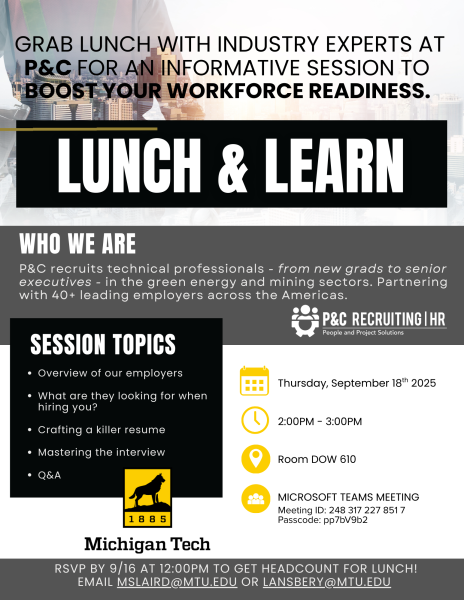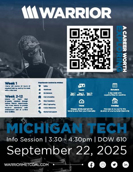 Info Session with Warrior Met Coal, September 22nd from 3:30 – 4:40 in Dow 610. This is the day before the MTU Career Fair.