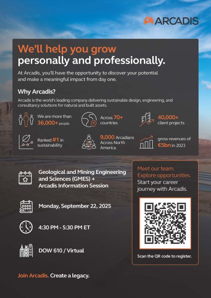 Join us for an exciting information session with Arcadis, a global leader in sustainable design, engineering, and consultancy solutions dedicated to improving quality of life and accelerating a planet-positive future. Learn how you can be part of a company that drives innovation and sustainability to tackle the world’s most pressing challenges.