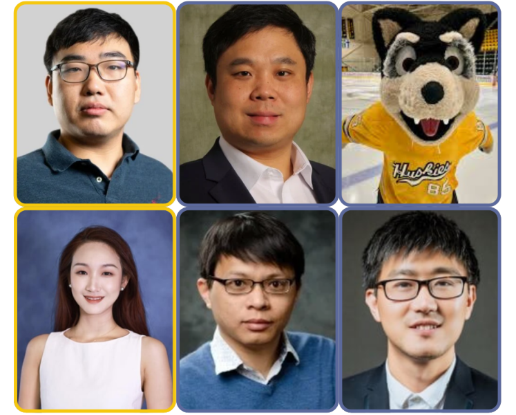 Pictured: from top left – Dr. Bo Xiao, Dr. Ronghua (Sam) Xu, Blizzard T. Husky. bottom row – Dr. Feiyu E, Dr. Bo Chen, Dr. Jie Wu