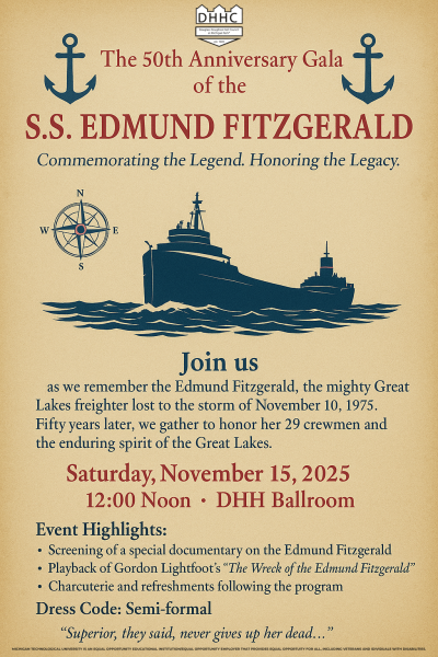 The Douglass Houghton Hall Council at Michigan Tech is hosting a special event commemorating the 50th anniversary of the S.S. Edmund Fitzgerald this Saturday, November 15, 2025, at 12:00 p.m. in the DHH Ballroom.