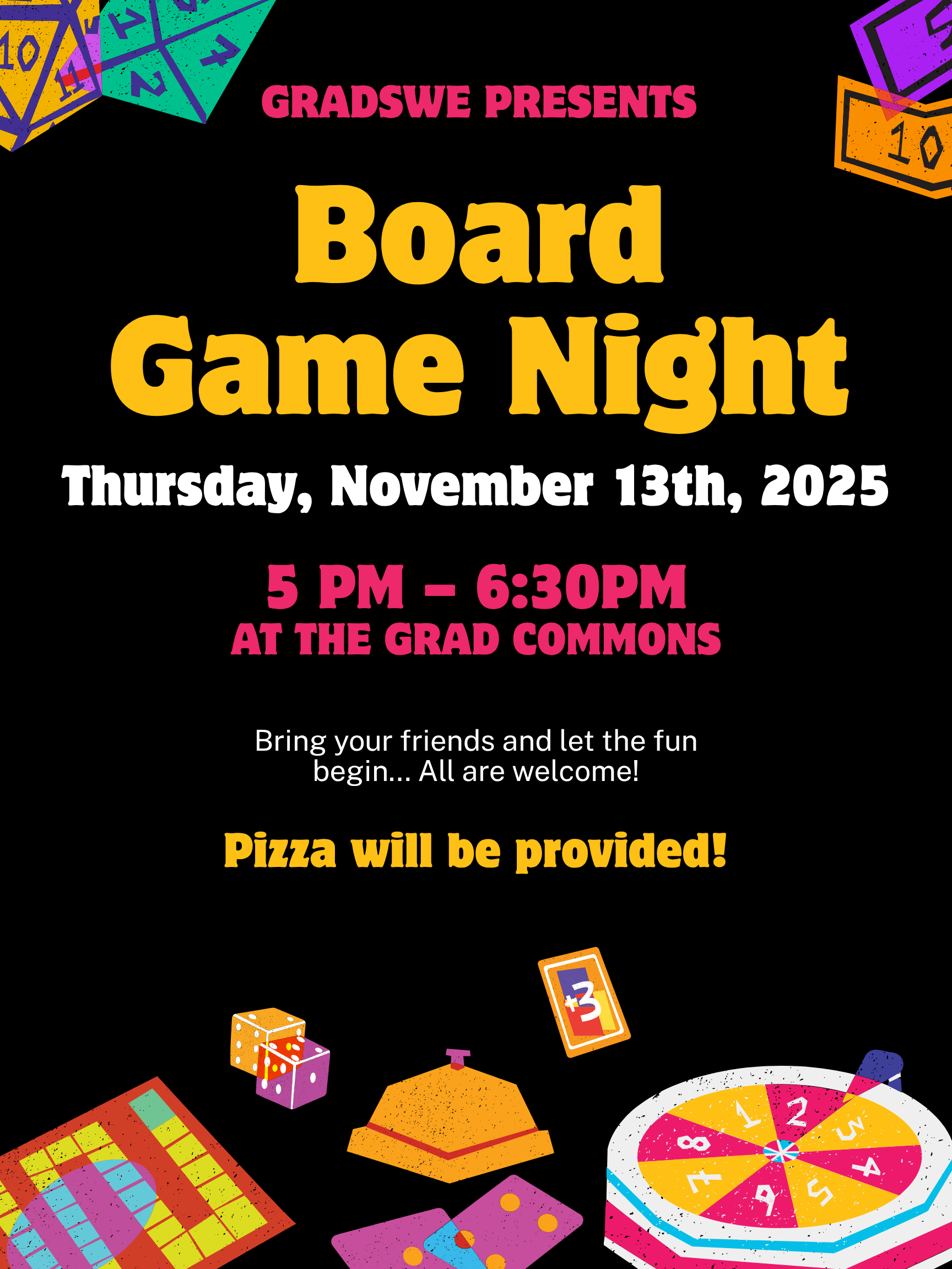 Join GradSWE at the Grad Commons on Thursday, November 13th, from 5-6:30pm for game night! All are welcome!