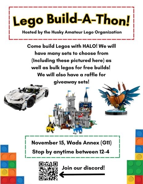 Looking for a fun thing to do this weekend? Come join the Husky Amateur Lego Organization for a Lego Build-A-Thon! We will have tons of sets available for your building pleasure, as well as bins of bulk bricks so you can build whatever you want. We will also be be doing a raffle for giveaway lego sets!