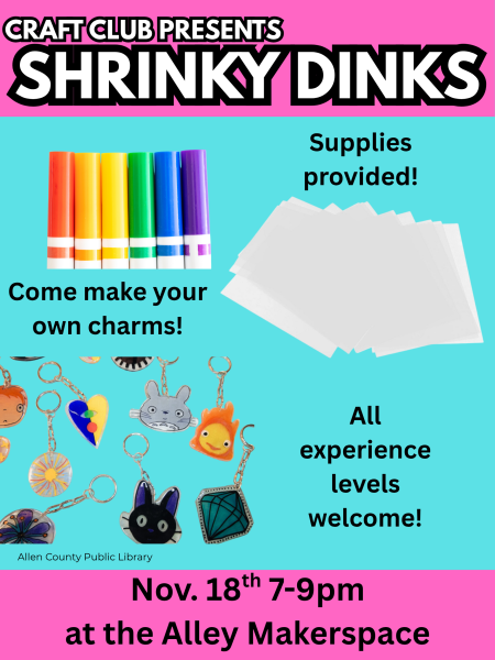 Husky Hobbies: Shrinky Dinks is Nov. 18th from 7-9pm in the Alley Makerspace! Come make your own little charms! Shrinky dink paper will be provided and all experience levels are welcome. Please sign up for the event on Involvement Link! You can still register even if your event fills up.