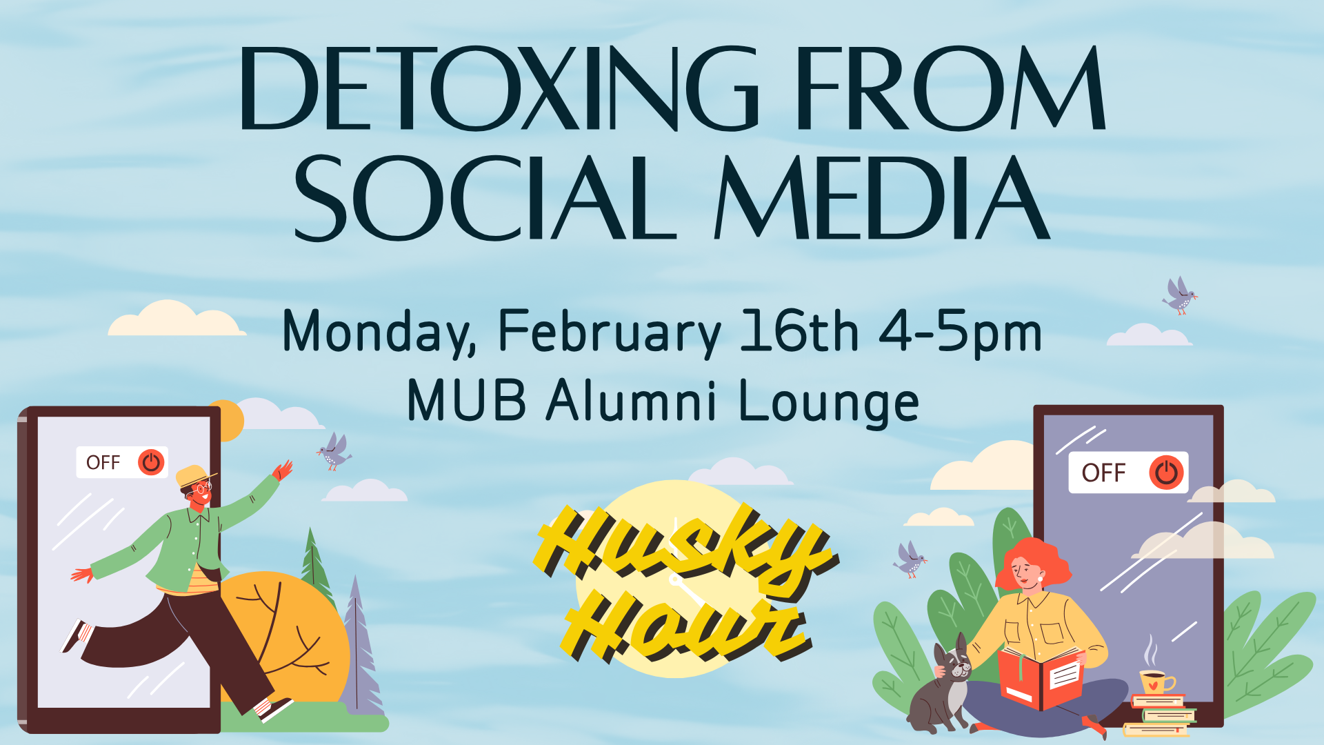 Social media plays a big role in how we connect, unwind, and spend our time, but it can also impact our stress, focus, and sleep. Join us for a Detoxing from Social Media Husky Hour to reflect on your relationship with social media, explore how it affects well-being, and learn practical strategies for creating healthier digital habits. Whether you’re looking to reset or just become more intentional, this conversation is for you.