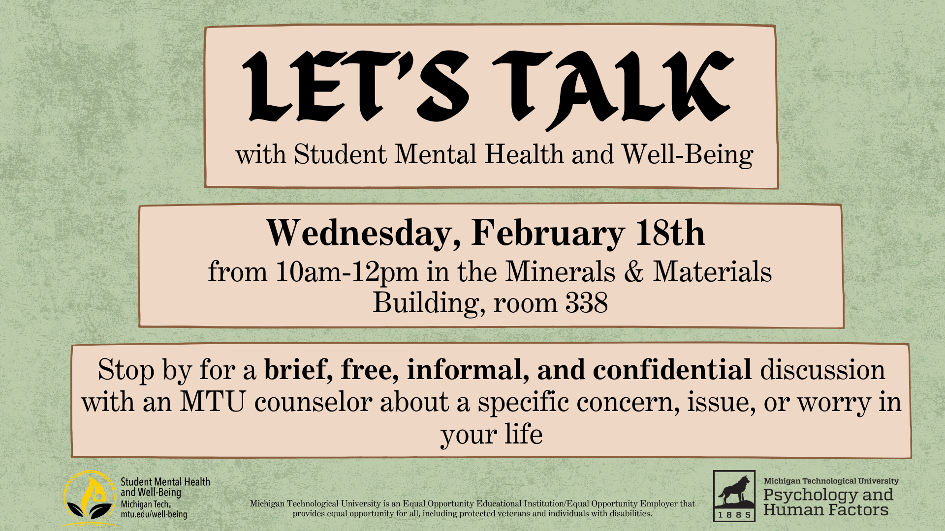 Curious about counseling or mental health resources? Join Let’s Talk with the Psychology & Human Factors department for a casual, confidential conversation with a Michigan Tech counselor. Perfect for students who want perspective on their own well-being or tips for supporting a friend. All students welcome!