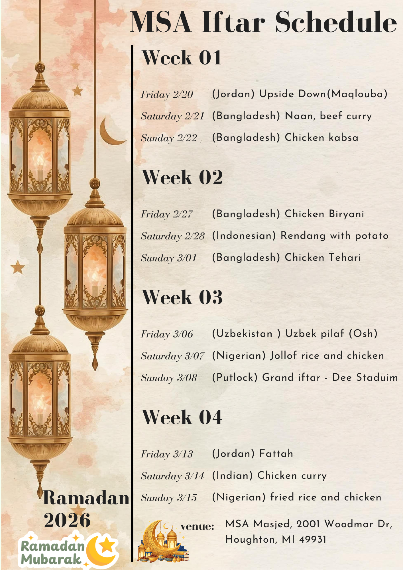 MSA Iftar Schedule – Ramadan 2026