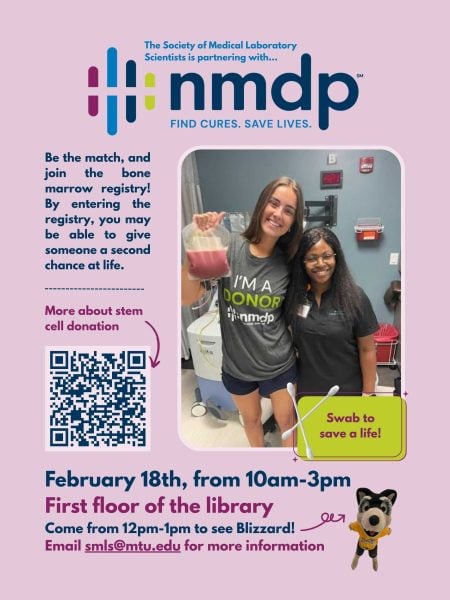 On February 18th, stop by the library any time between 10am to 3pm to see if you qualify for the registry. You will then swab your mouth. After you swab, NMDP will reach out at any point to let you know if you’re a match! Please reach out to smls@mtu.edu for more information. An NMDP representative will be at our table to answer any specific questions you may have!