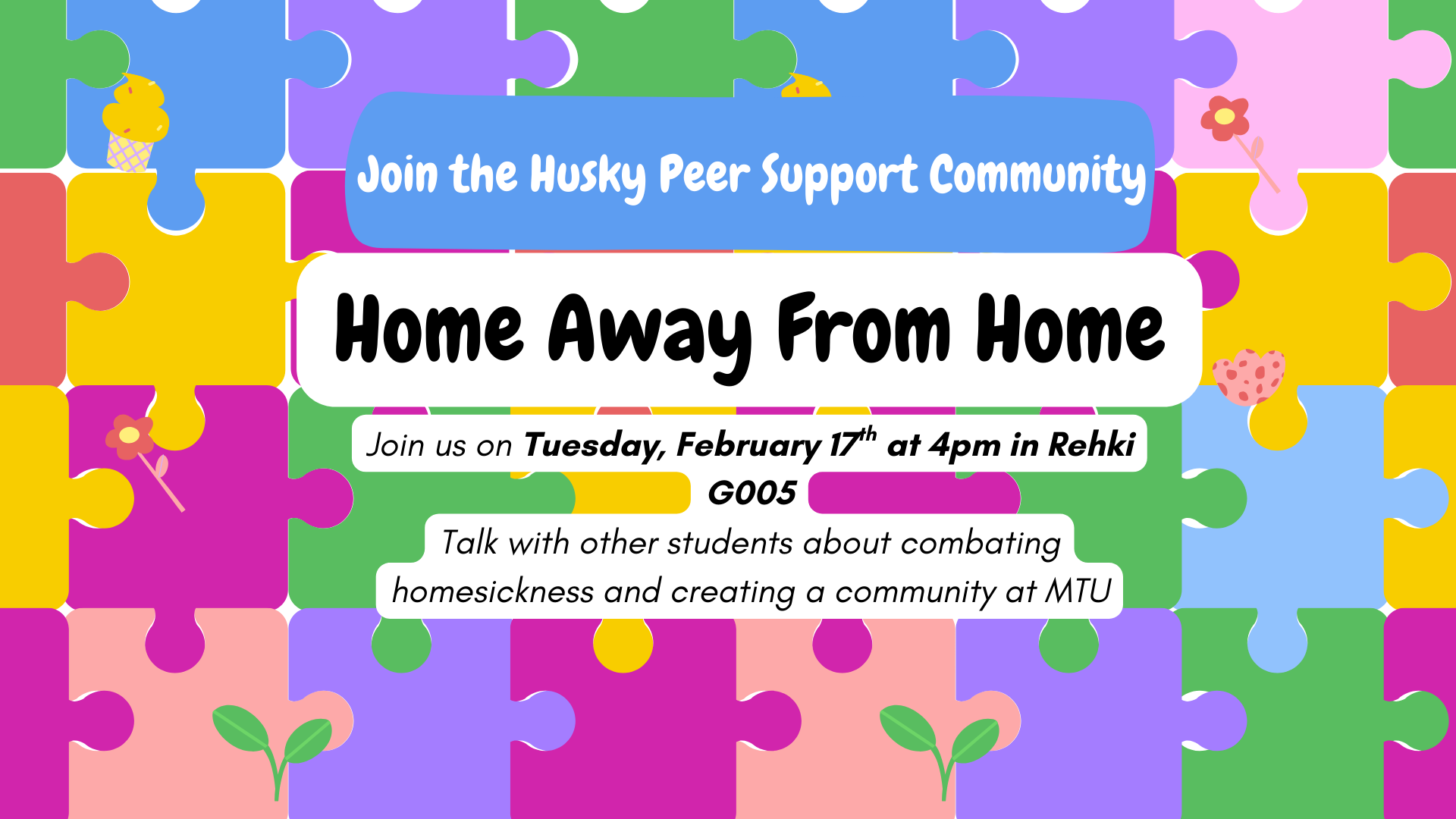 Join us on February 17th at 4pm for a low-key conversation about homesickness and making school your ‘home away from home’. We will cover how homesickness can affect you, and how you can combat it!
