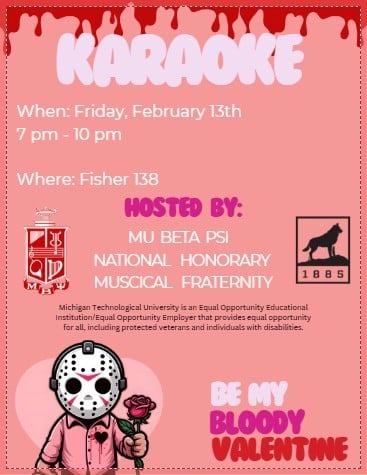 Mu Beta Psi is hosting a karaoke session February 13th, 7-10PM! All MTU students are invited to pop on by Fisher 138, say hi, and sing a tune or two.