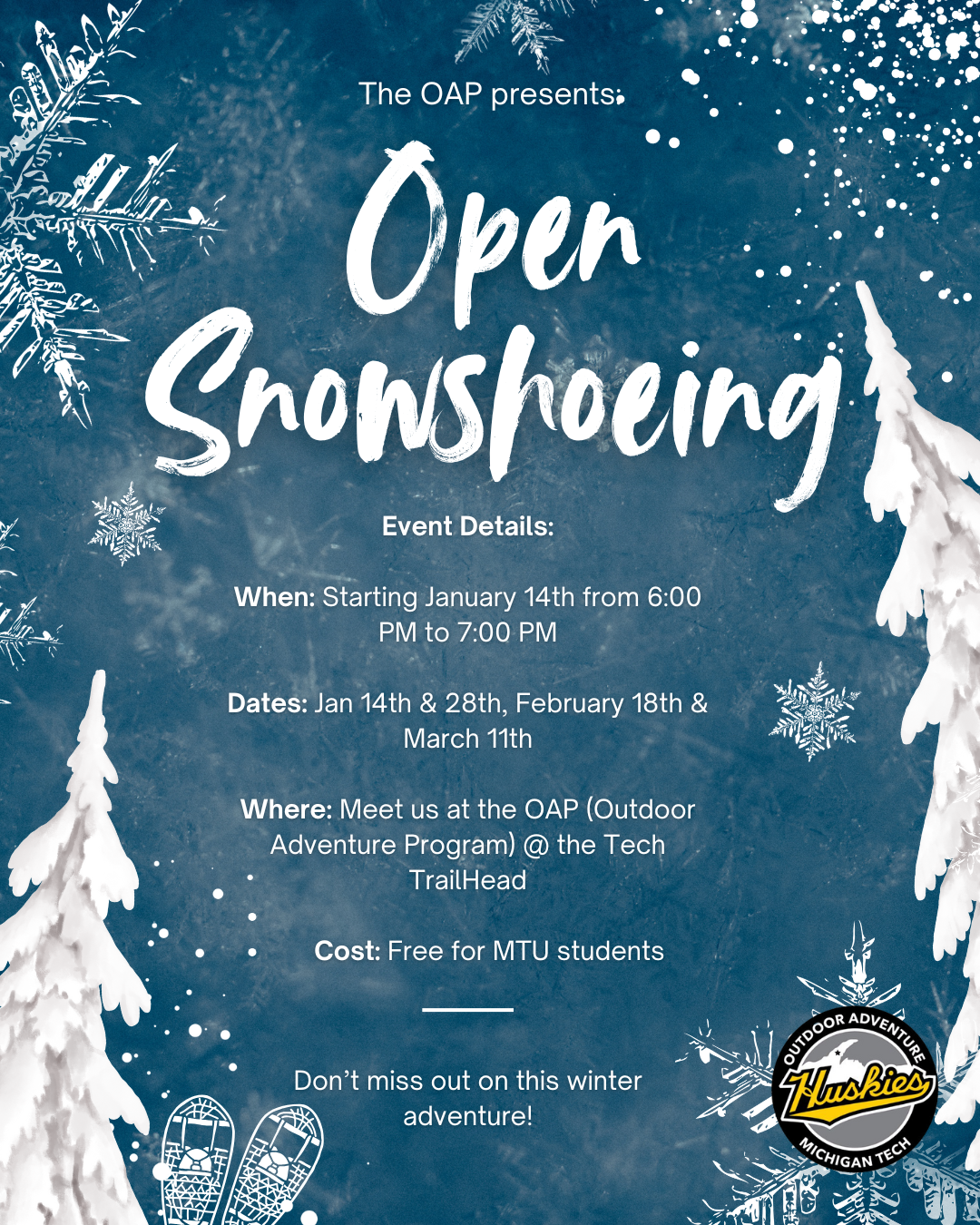 Dress warmly and come snowshoe the MTU trail system with us!