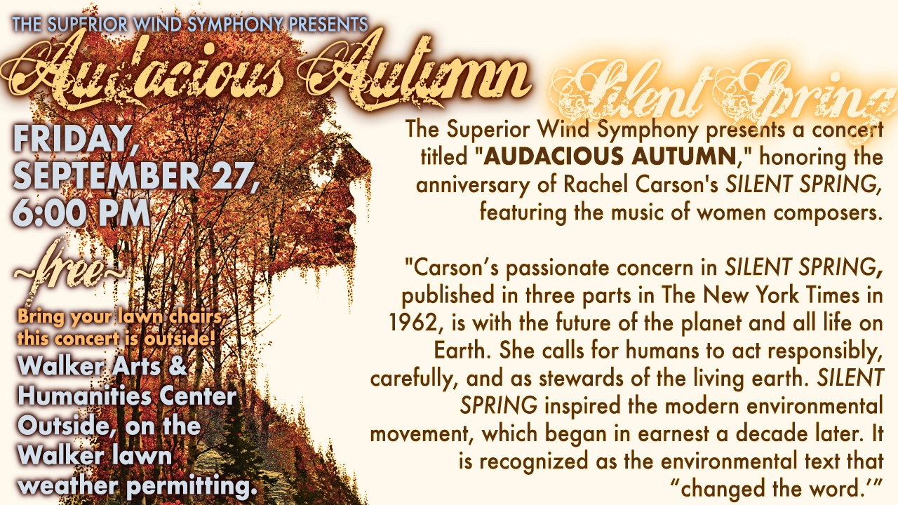 Bring your lawn chairs, bring your blankets: The Rozsa Center for the Performing Arts and Department of Visual and Performing Arts presents a concert by the Superior Wind Symphony (SWS), titled “Audacious Autumn,” honoring the anniversary of Rachel Carson’s Silent Spring, featuring the music of women composers. They will perform a free outdoor concert on the Walker lawn on Friday, September 27, at 6:00 PM. If it rains, the concert will be held inside the McArdle Theatre, 2nd floor Walker.  For more details, please see the attached press release.