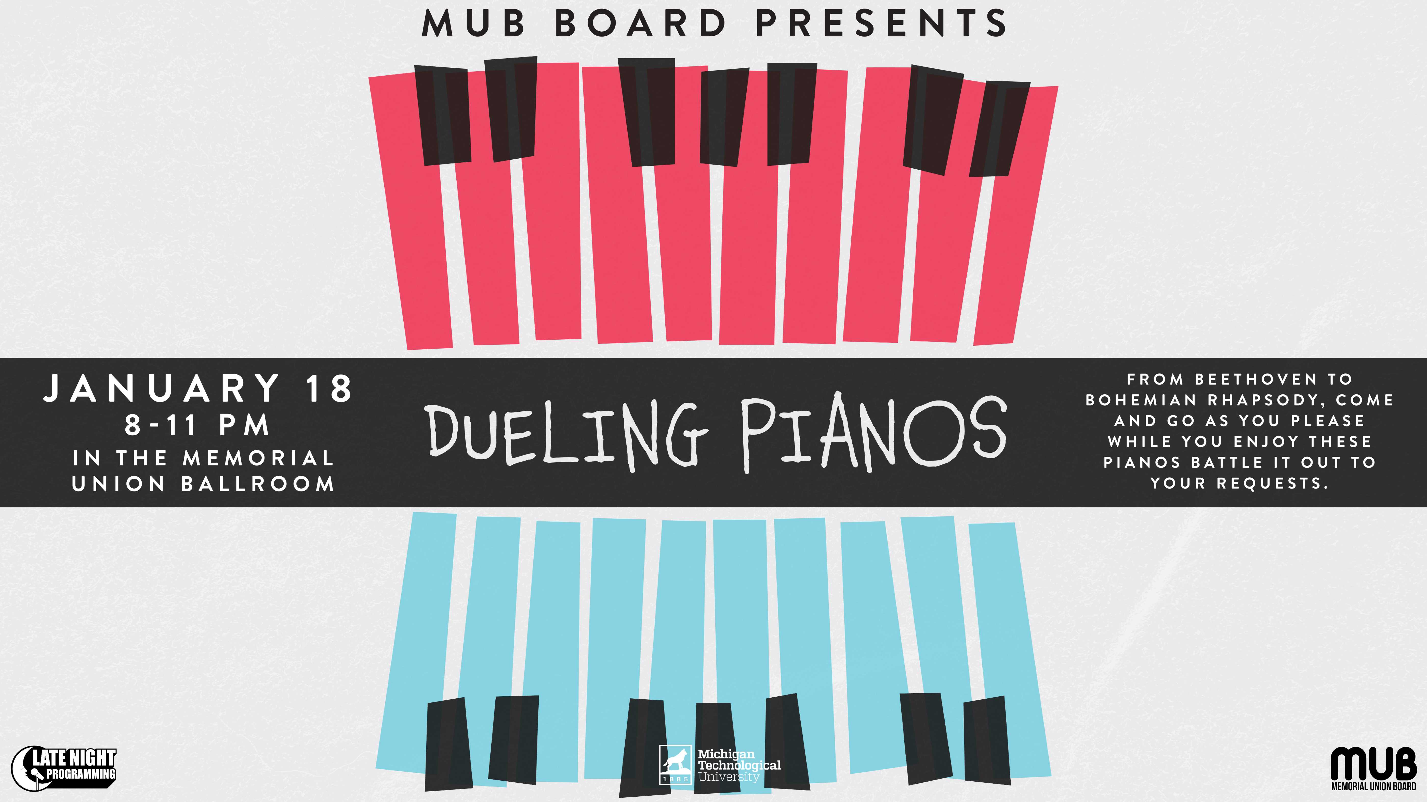 Join MUB Board and Late Night Programming for Dueling Pianos on January 18th from 8 to 11 pm in the MUB Ballroom. From Beethoven to Bohemian Rhapsody, these dueling pianos will be singing and playing requests from the crowd. Bring your friends, bring your family, come and go as you please while you enjoy some good food and even better music.