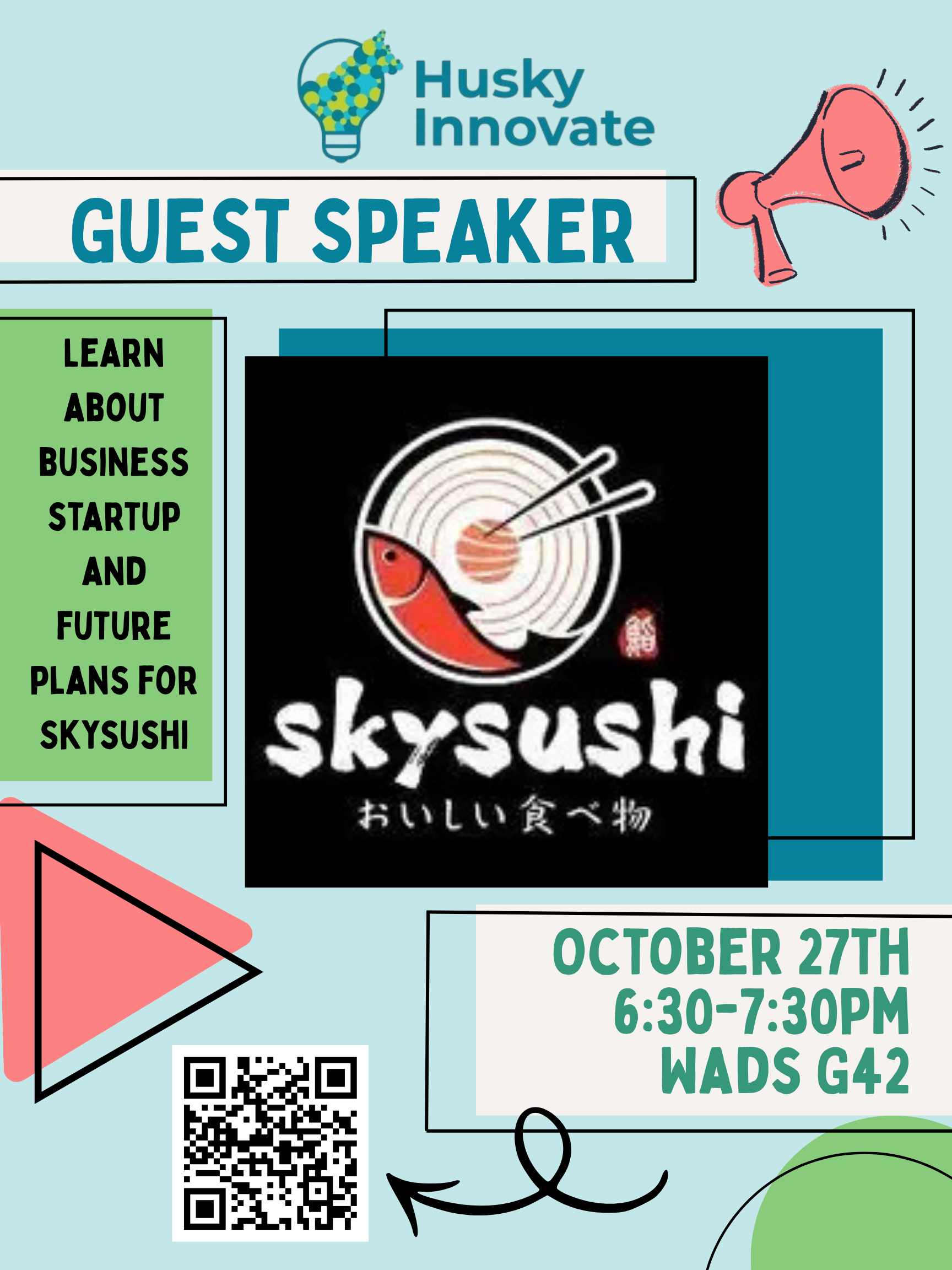 Join Husky Innovate as we hear from a guest speaker from sky sushi! Learn what it takes to start and run a business as well as know more about the future of sky sushi. This event will be hosted on October 27th, 6:30-7:30pm, Wadsworth Hall G42. Visit our website to learn more.