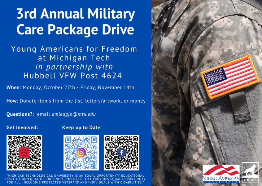 Young Americans for Freedom at Michigan Tech in partnership with Hubbell VFW Post 4624 invite you to participate in their 3rd annual Military Care Package Drive. The drive will run from Monday, October 27th – Friday, November 14th. It will send care packages containing food, hygiene products, and entertainment items, as well as handmade letters and artwork, to deployed service members. We aim to bring hope, joy, and the comforts of home to deployed troops throughout the holiday season. The following are ways you can contribute: