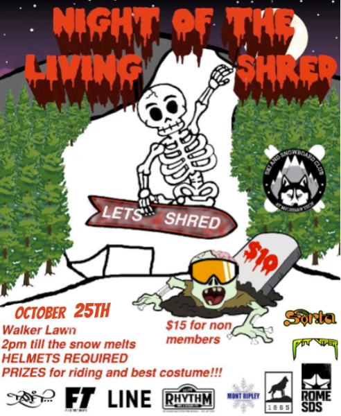 Join the Ski and Snowboard club for our on campus Night of the Living shred Rail Jam/ Costume contest/ raffle on October 25th at walker lawn 2pm until the snow melts!!