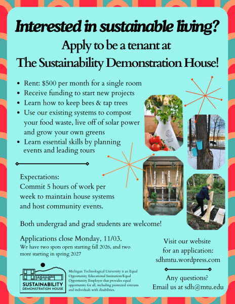 Join a crew of 6 MTU students working to live sustainably and share our sustainable solutions with the surrounding community! The extended deadline to apply is Monday, November 3rd!