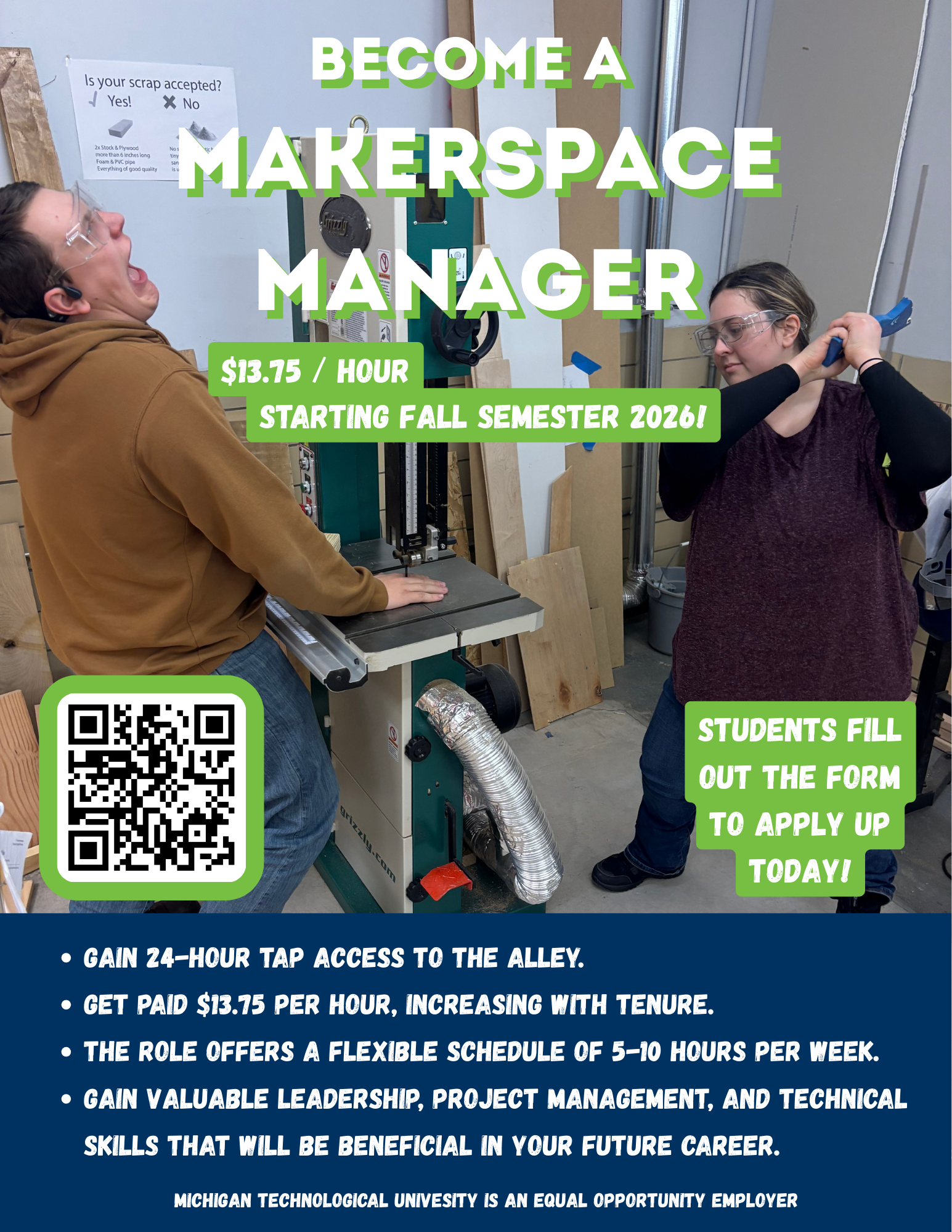BUT! We are hiring NEW MANAGERS for the Alley Makerspace next academic year. We are looking to hire two permanent managers and one temporary manager while manager Alex is on co-op. This position is open for anyone to apply, so feel free to throw your hat in the ring.