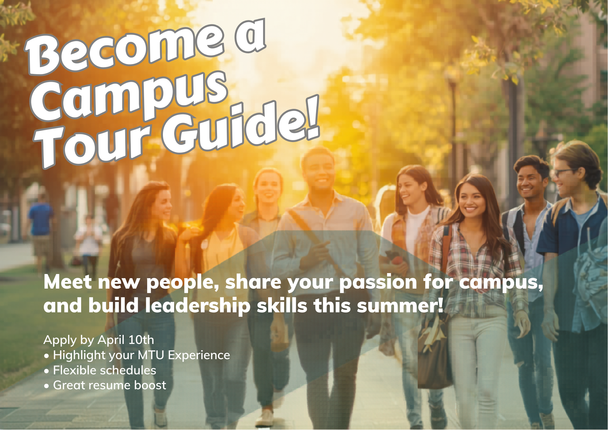 Join Michigan Tech Admissions as a Tour Guide and share your unique MTU experience with prospective students and their families. As a Tour Guide, you will be responsible for giving campus tours, participating in special visits/events, and being knowledgeable about the Michigan Tech campus.