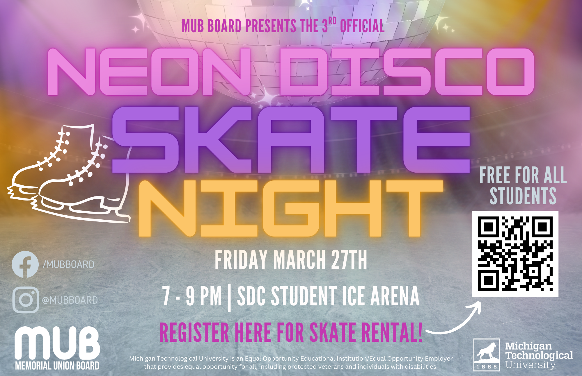 The popular neon disco skate night is BACK! Join for a night of fun lights, awesome music and FREE skate rentals! Sign up here for a timeslot rental or if you have your own skates show up any time! (Helmets are required for all) We hope to see you there for this night of skating fun!