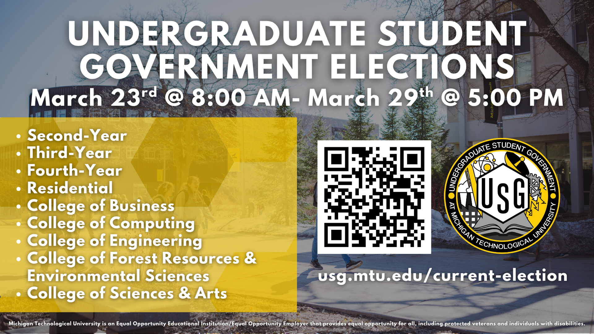 Visit usg.mtu.edu/current-election to place your vote anytime between now and Sunday 3/29 at 5pm. Cast your vote to ensure that your voice is heard!