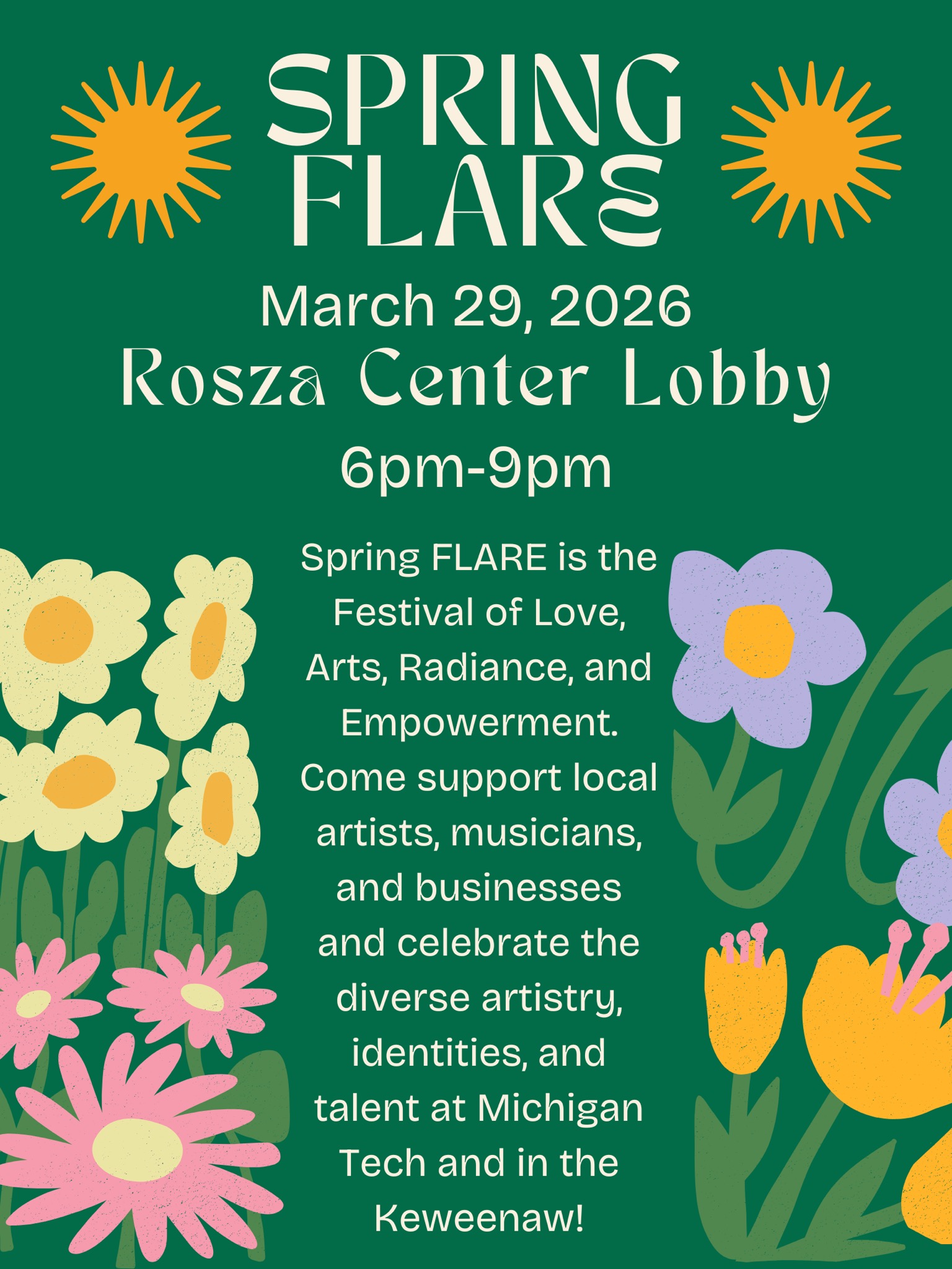 Come join Keweenaw Pride, The Daily Bull, AAAA, and more of your favorite RSOs in celebrating what makes our Tech community awesome. Joined by local bands and artists, Spring FLARE is an amazing way to spend an evening in the company of friends. Hosted in the Rosza Center lobby on this coming Sunday, March 29th from 6-9pm.