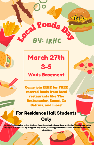 IRHC (Inter-Residence Housing Council) is hosting Local Foods Day on Friday, March 27th, 2026, in the Wads annex (so in your classroom!). We are catering from many restaurants in Houghton and Hancock and providing a free tasting opportunity for all students! It’s free, all you can eat, and we have LOTS of food. We are hoping to give students the chance to enjoy the food scene of the area without the financial or transportation barrier.
