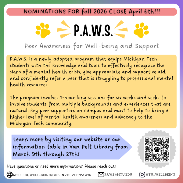 P.A.W.S. (Peer Awareness for Well-Being and Support) is accepting nominations for the Fall 2026 cohort! P.A.W.S. is a program designed to foster mental health awareness and peer support education.
