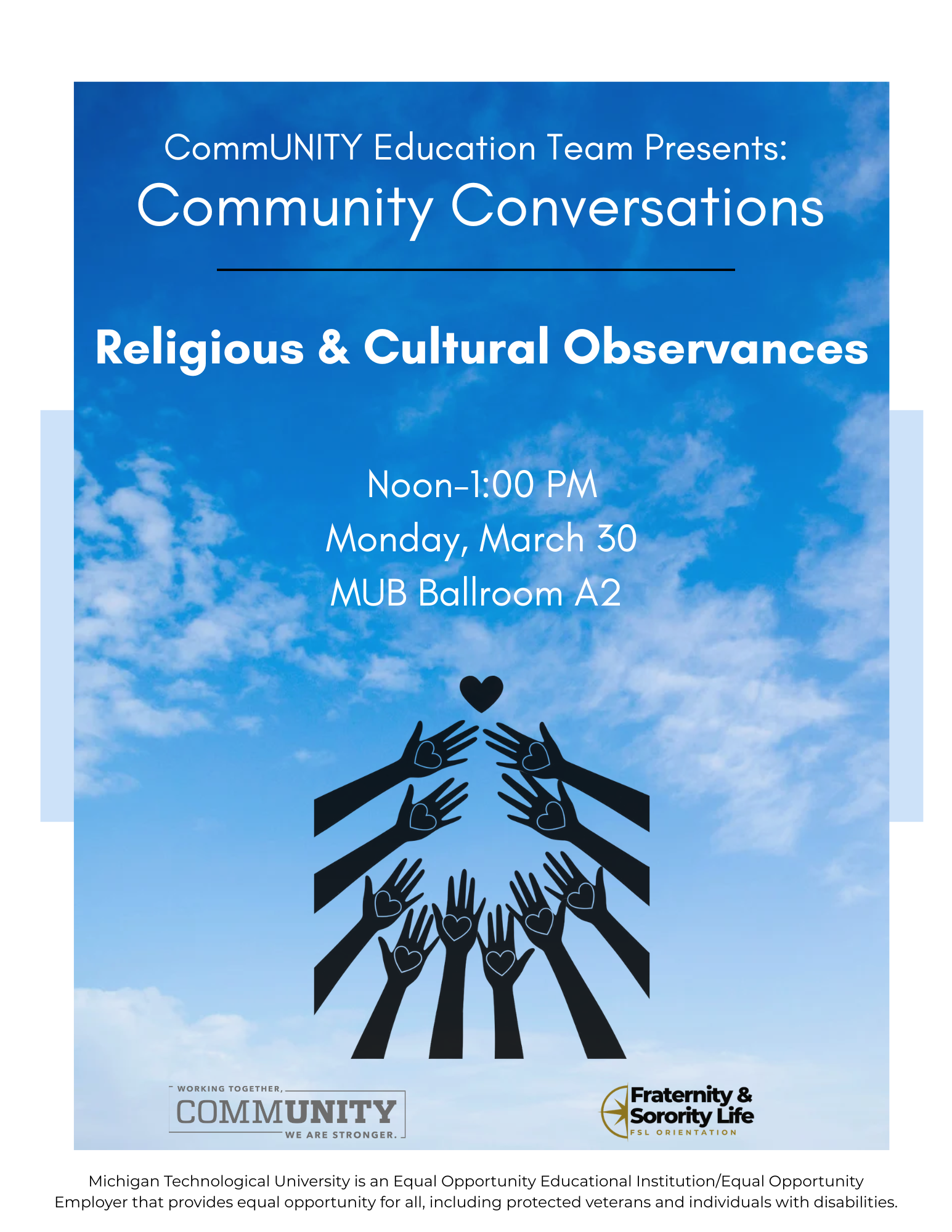 This event invites our campus community to come together to listen, learn and reflect on their lived experiences within and beyond Michigan Technological University. Through personal stories and open dialogue, our panelists will share insights about their religious and cultural observances, and challenges/barriers they have faced observing them on campus. Attendees will have the opportunity to ask questions and engage in meaningful discussion.