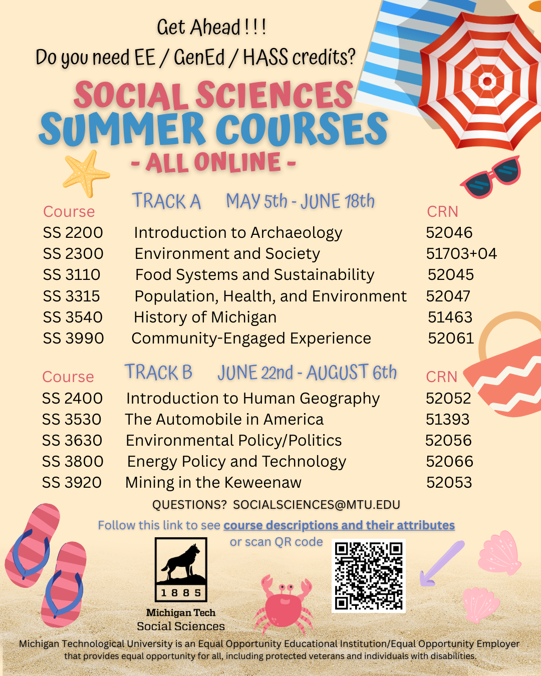 Do you need to fulfill Essential Ed or Gen Ed credits? Do it this summer! All Social Sciences summer courses are online, so you can do them from anywhere on a flexible schedule. Click here or on the image to see course descriptions, instructors and which requirements they fulfill. Email socialsciences@mtu.edu with any questions!