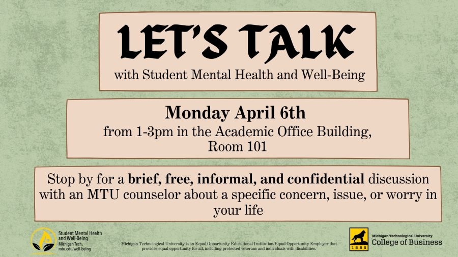 Balancing classes, projects, or personal stress? Let’s Talk, in partnership with the College of Business, is a no-pressure, confidential conversation with a Michigan Tech counselor. Get guidance for yourself, support a friend, and learn about mental health resources, all in a friendly, informal setting. All students welcome!
