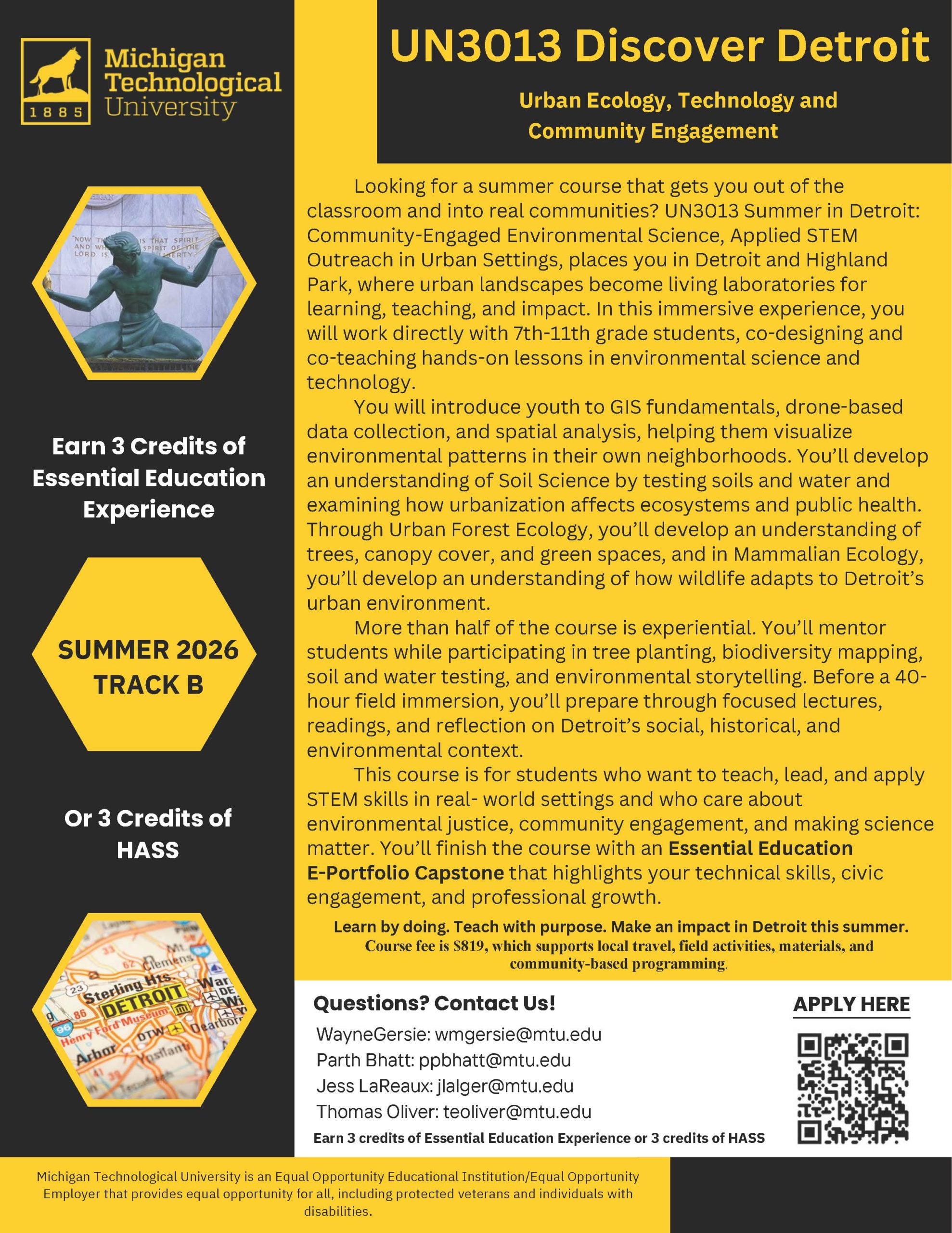 Are you looking for a summer course that goes beyond lectures and exams—one that lets you apply what you’re learning in real communities, with real impact? If you’re interested in environmental science, sustainability, cities, or working with people, we invite you to consider a new Summer 2026 course: UN3013 – Summer in Detroit: Community-Engaged Environmental Science.