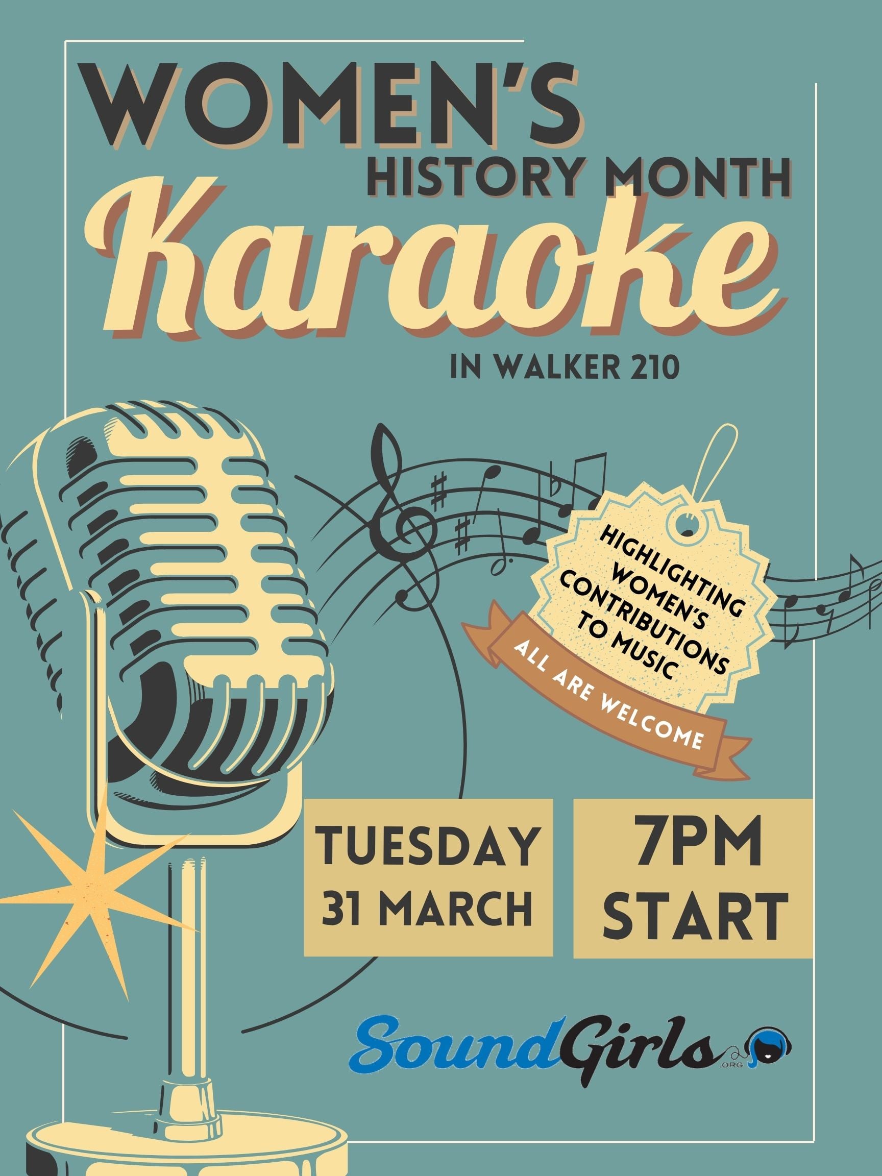 Join the SoundGirls MTU Chapter for our second annual Women’s History Month Karaoke event! All are welcome to come sing and celebrate women’s contributions to the music industry!