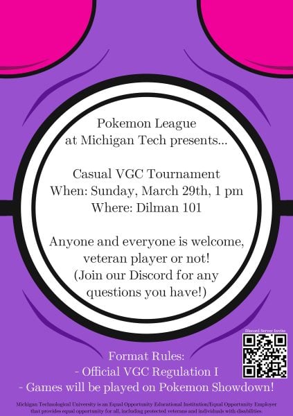 The Pokemon club on campus is hosting a VGC tournament on Pokemon showdown! All the information can be found on the poster. We want to emphasize that this is open to all levels of players, and if you want help teambuilding, there are people on the discord who would love to help!