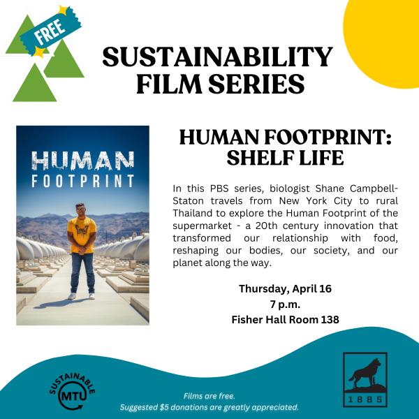 ‘Human Footprint: Shelf Life’ will be shown at 7 p.m. on Thursday, April 16 in Fisher Hall 138. Refreshments will be provided, and each film will be followed by a facilitated discussion. The Sustainability Film Series is free and everyone is welcome to attend. A suggested $5 donation is appreciated and helps to support the continued offering of this film series.