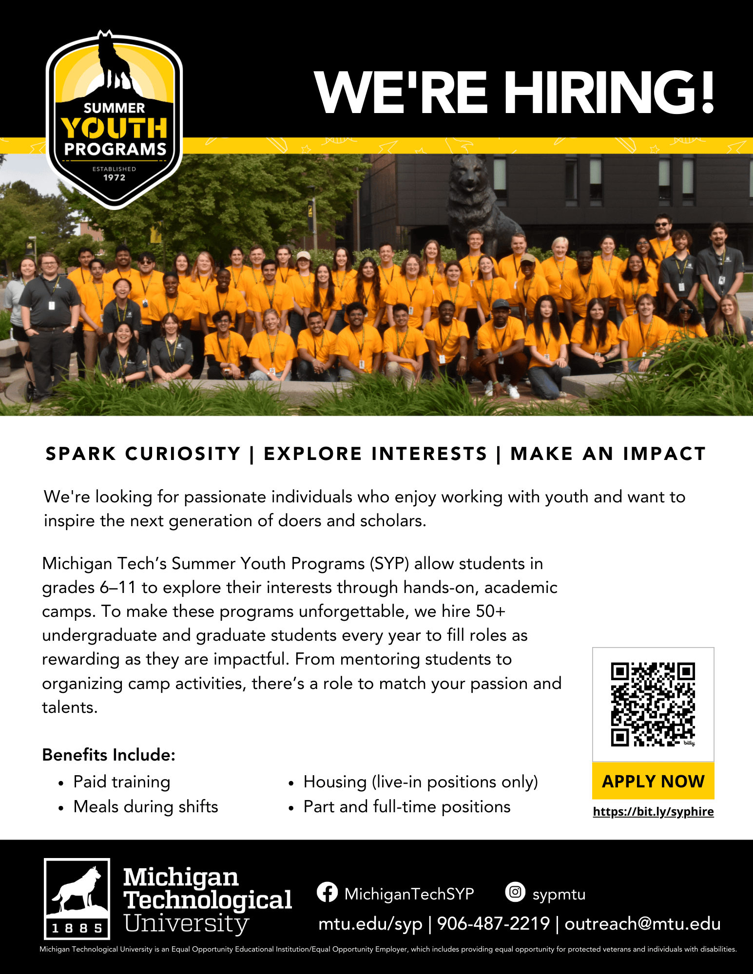 If you’re interested in a meaningful, fun, and resume-building summer opportunity, or just want to learn more, visit our website (mtu.edu/syp/about/employment) for position details, application instructions, and more.