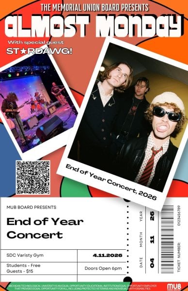 We are proud to announce that the band almost monday will be play AT MTU! Saturday April 11th join us in the SDC Varsity Gym, free for students!! There will also be an opening act from local band Star Dawg, make sure to get your tickets here!