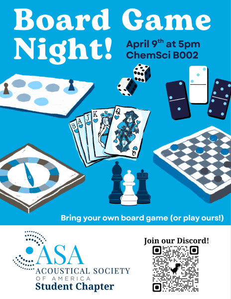 The Acoustical Society of America Student Chapter will be hosting a board game night on Thursday, April 9th at 5pm in ChemSci B002. Board games will be provided but feel free to bring your own!
