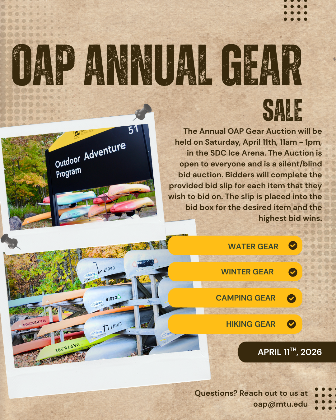 Gear up for adventure at unbeatable prices. Join Michigan Tech Recreation for the Outdoor Adventure Program (OAP) Annual Silent Gear Auction and bid on high-quality, used outdoor equipment as we make room for brand-new gear. Don’t miss your chance to score great deals!