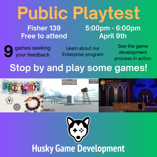 Husky Game Development Enterprise is hosting a public playtest this Thursday, April 9th inside Fisher 139 from 5pm-6pm. Many of the current teams will have their games on devices ready to be played by anyone interested! You only need to bring yourself!