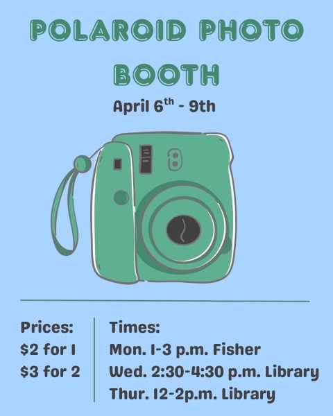 Want a souvenir of your college experience? A fun photo of you and your friends? Come to our photo booth fundraiser in Fisher and the Library for a picture worth a thousand words! Pictures will be taken on a Poloroid camera and given to you on the spot.