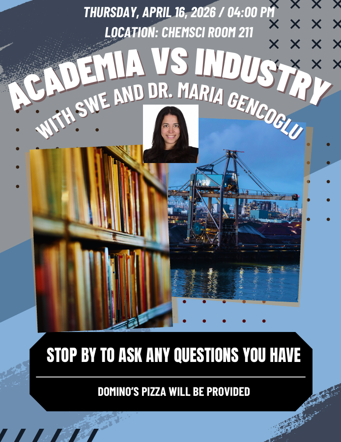 Join SWE and our special guest, Dr. Maria Gencoglu, to learn more about pursuing a career in academia vs industry on Thursday, April 16th, at 4pm in ChemSci 211. Pizza will be provided!