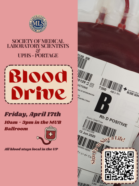 The Society of Medical Laboratory Scientists is hosting our semesterly blood drive on Friday, April 17th, in the MUB Ballroom from 10am to 3pm! All of the blood collected will stay right here in the UP, supporting our rural community who is in great need of blood.