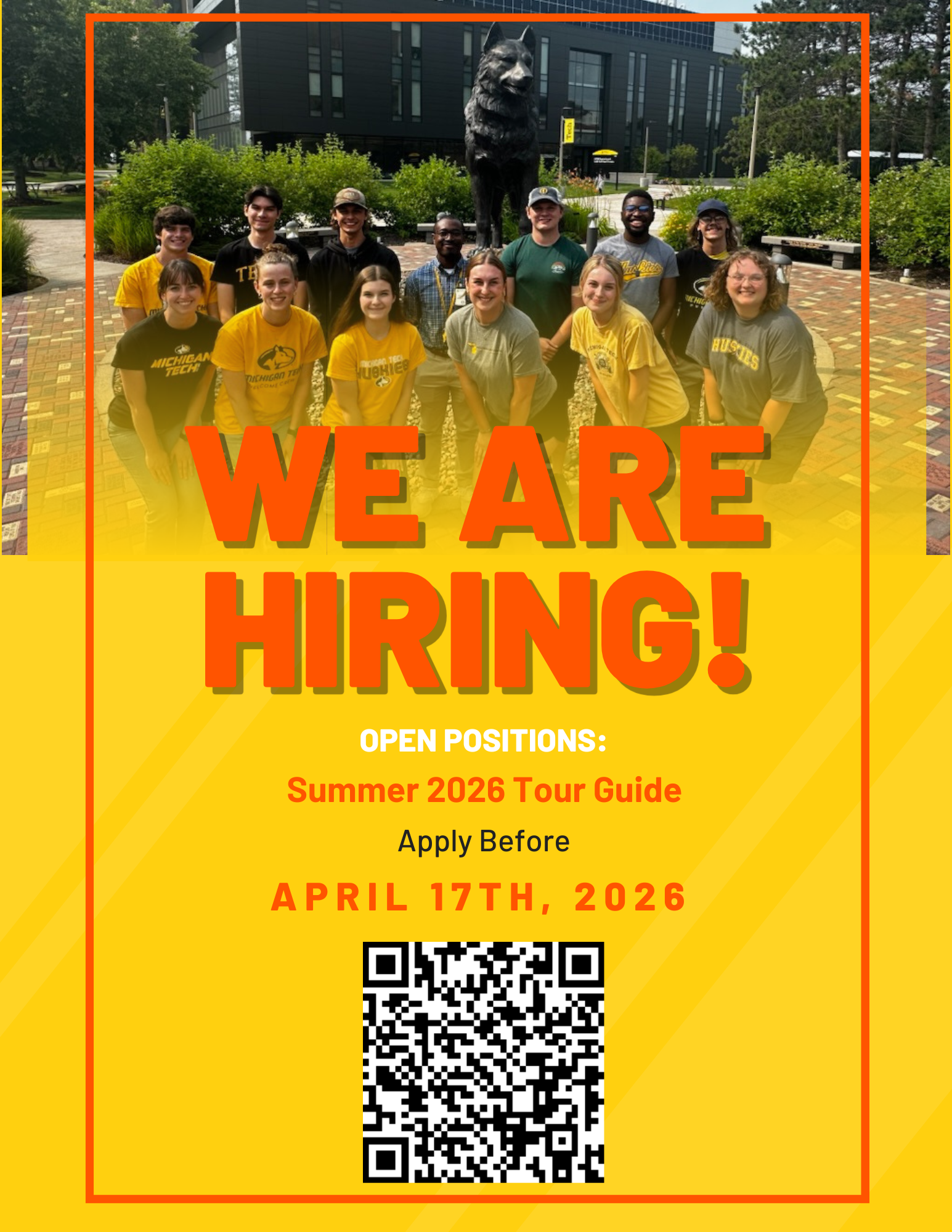 Join Michigan Tech Admissions as a Tour Guide and share your unique MTU experience with prospective students and their families. As a Tour Guide, you will be responsible for giving campus tours, participating in special visits/events, and being knowledgeable about the Michigan Tech campus. Applications can be submitted here: