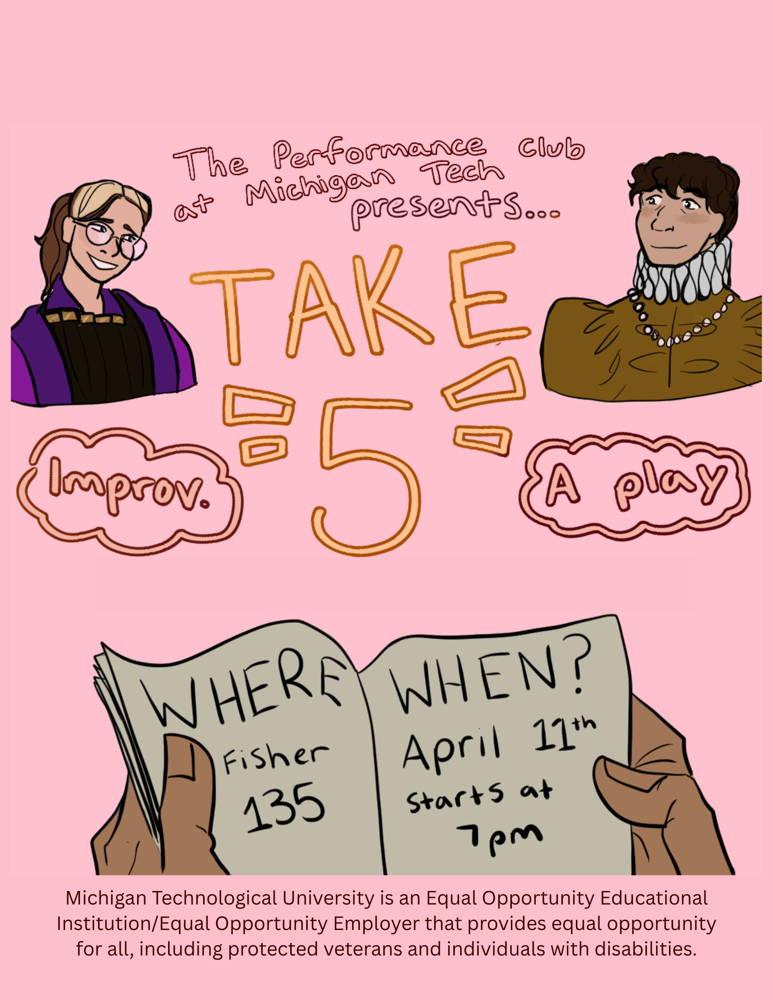 Get ready for a night of comedy and theater! This Saturday at 7:00 pm, the Performance Club at MTU will be hosting a play called “Take 5.” This is a 5-act take on Shakespeare’s Much Ado About Nothing. It is abridged and directed by the Performance Club at MTU.
