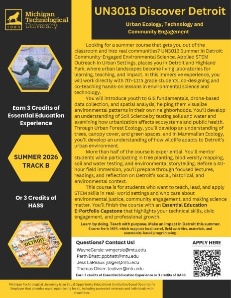 This course offers a unique opportunity to step outside the traditional classroom and learn environmental science through direct, hands-on engagement in the Detroit Metro and Highland Park communities. Rather than only exploring environmental challenges, you will work alongside community partners and middle and high school students to explore how urban environments function and how science can support healthier, more just communities.