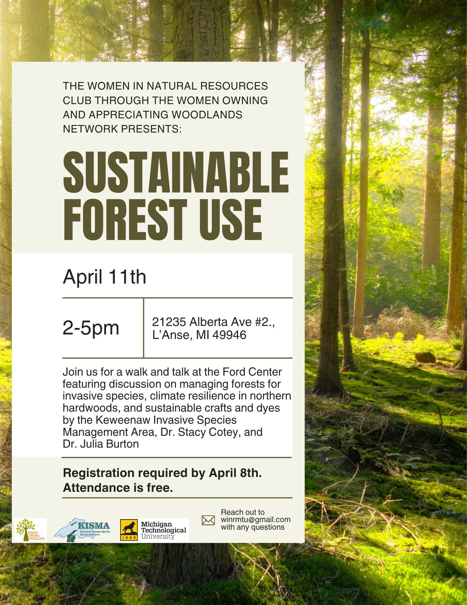 The Women in Natural Resource Club is hosting a Sustainable Forest Use Walk and Talk through the Women Owning and Appreciating Woodlands Network on April 11th. There will be speakers discussing managing forests for invasive species, climate resilience in northern hardwoods, and sustainable crafts and dyes. If you’re interested in attending, please fill out the registration form linked here by April 8th. The event is from 2pm-5pm at the Ford Center in Alberta and is free to attend. Please reach out to winrmtu@gmail.com with any questions.