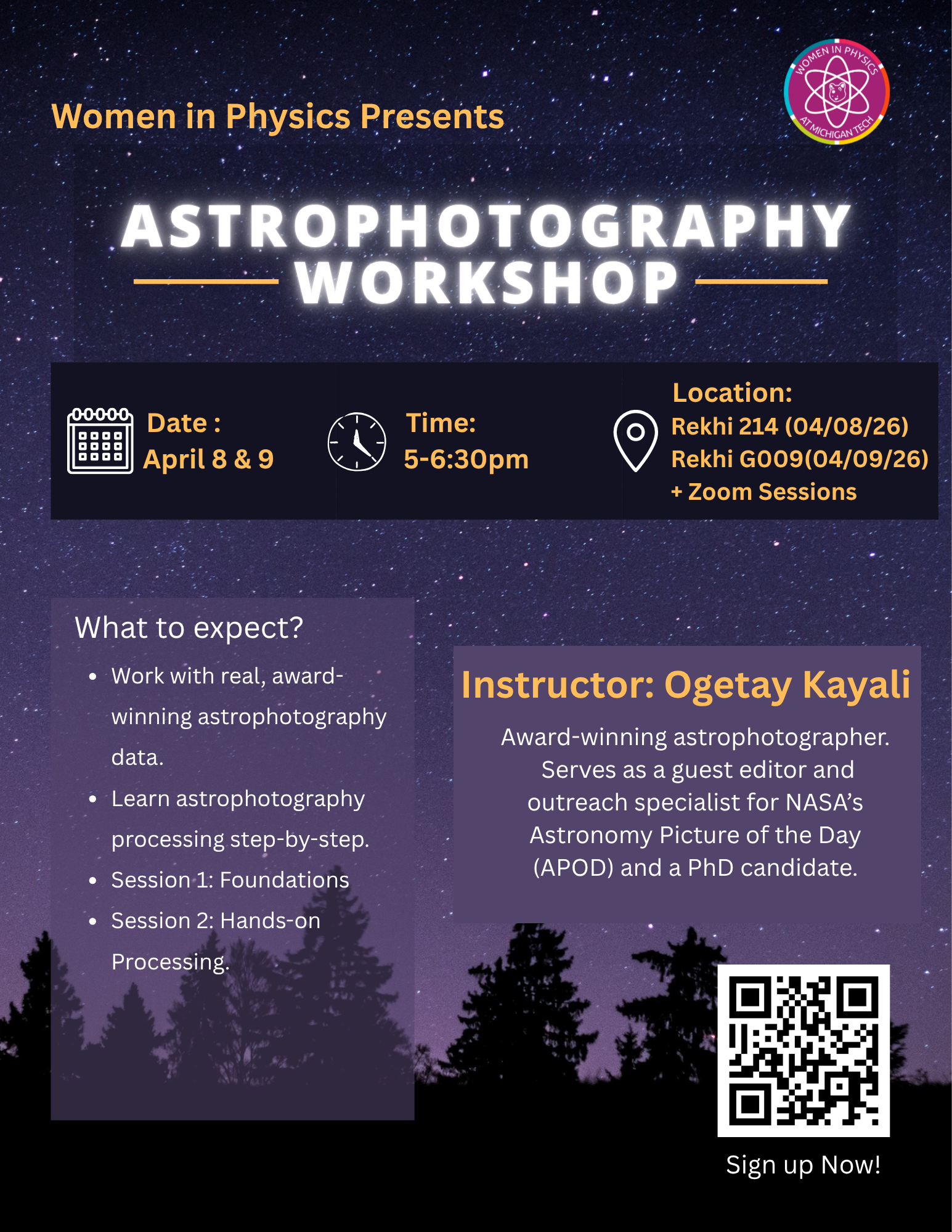 Women in Physics is excited to invite you to an Astrophotography Workshop led by Ogetay Kayali, an award-winning astrophotographer and PhD candidate. He also serves as a guest editor and outreach specialist for NASA’s Astronomy Picture of the Day (APOD). Here is his website for more information